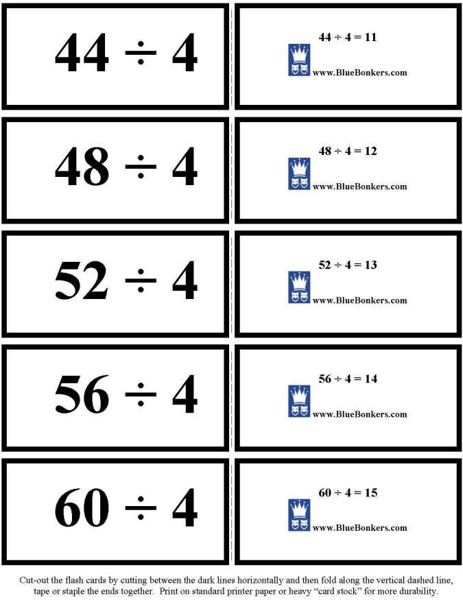Flash Cards - Division by 4(Four's) - 11 thru 15